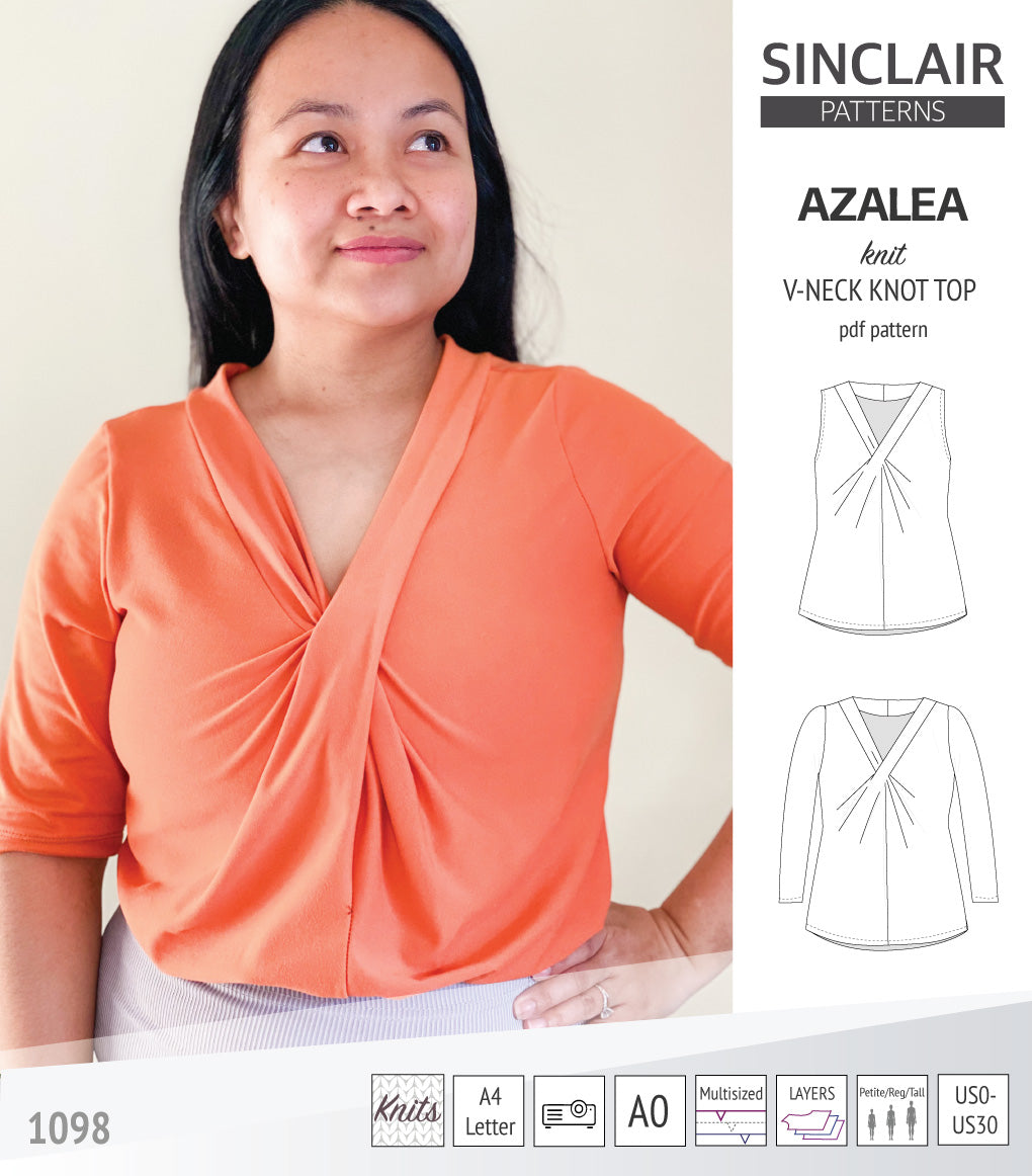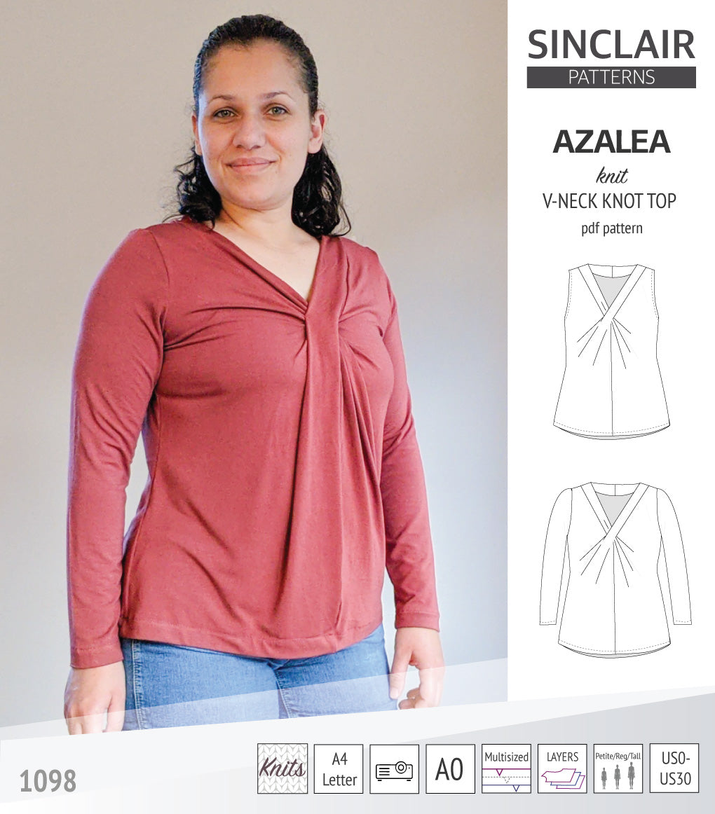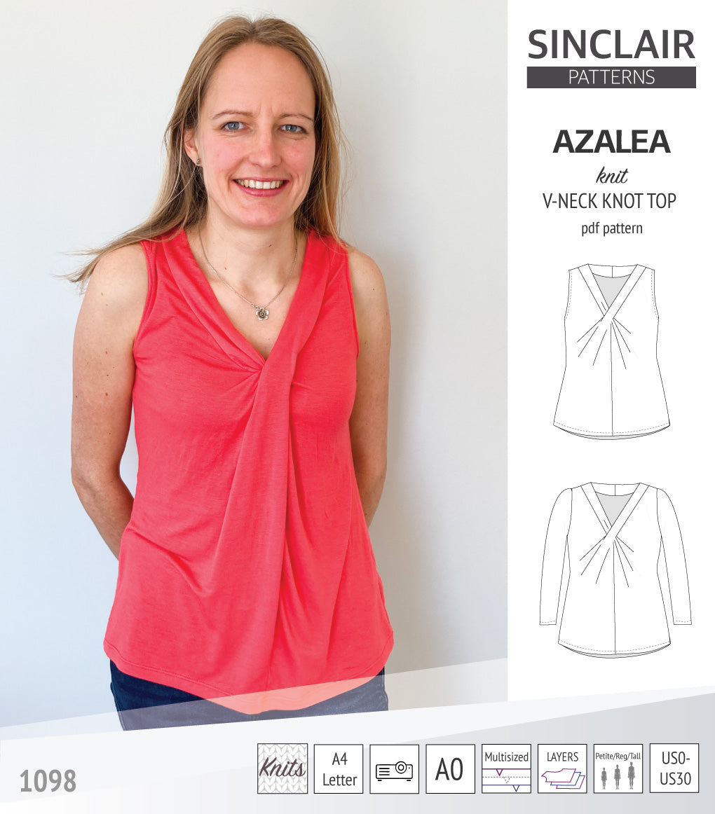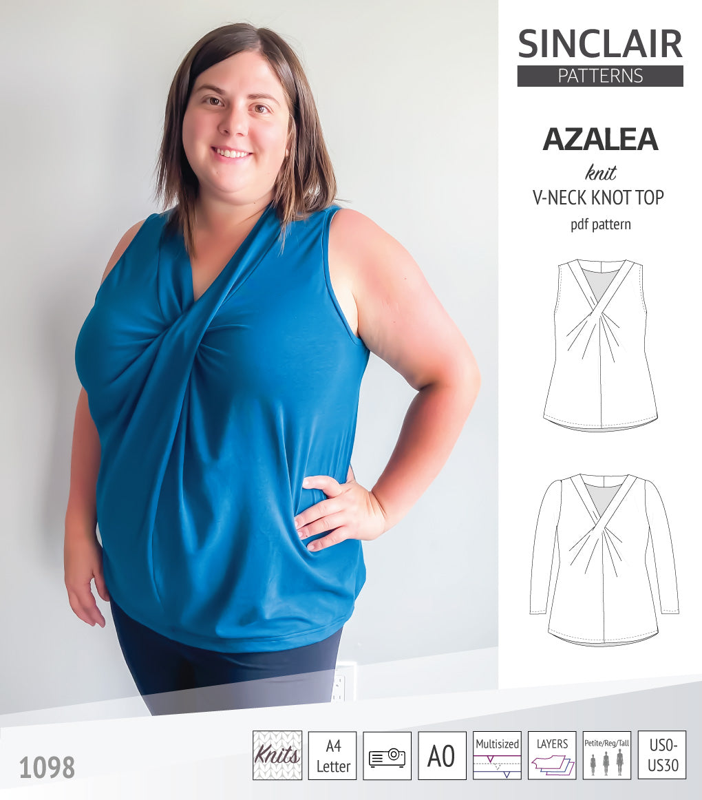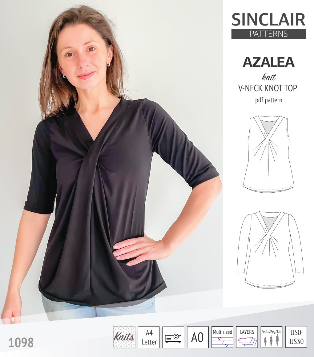 Basic fit: Fitted at the shoulders and bust, relaxed at the waist and hips top with medium depth V-neck finished with an accent knot, designed for knit fabrics. Comes in hip length top. Offered with short, elbow, 3/4 or long sleeves. Can be made as a sleeveless top with the armholes finished with bindings.