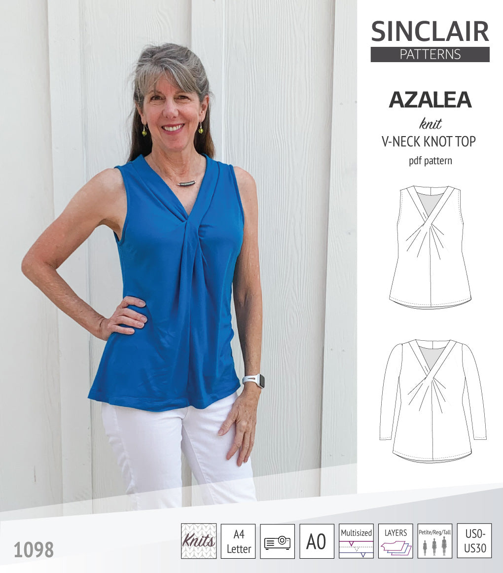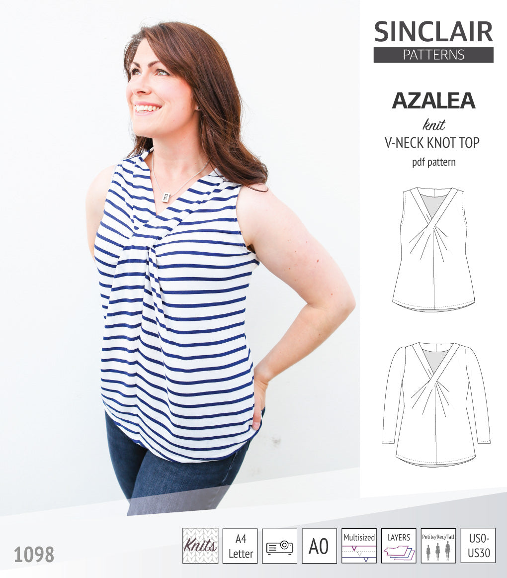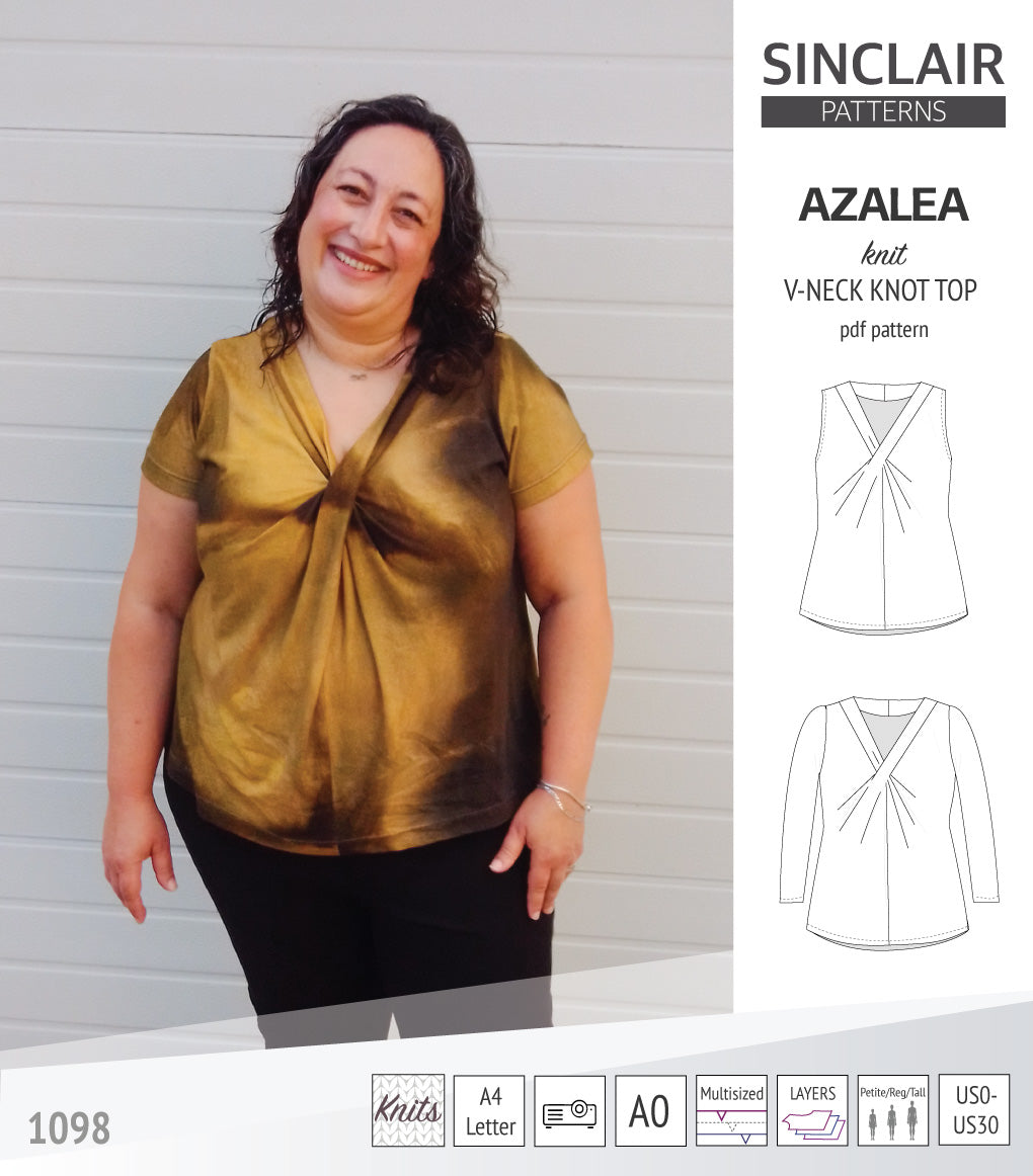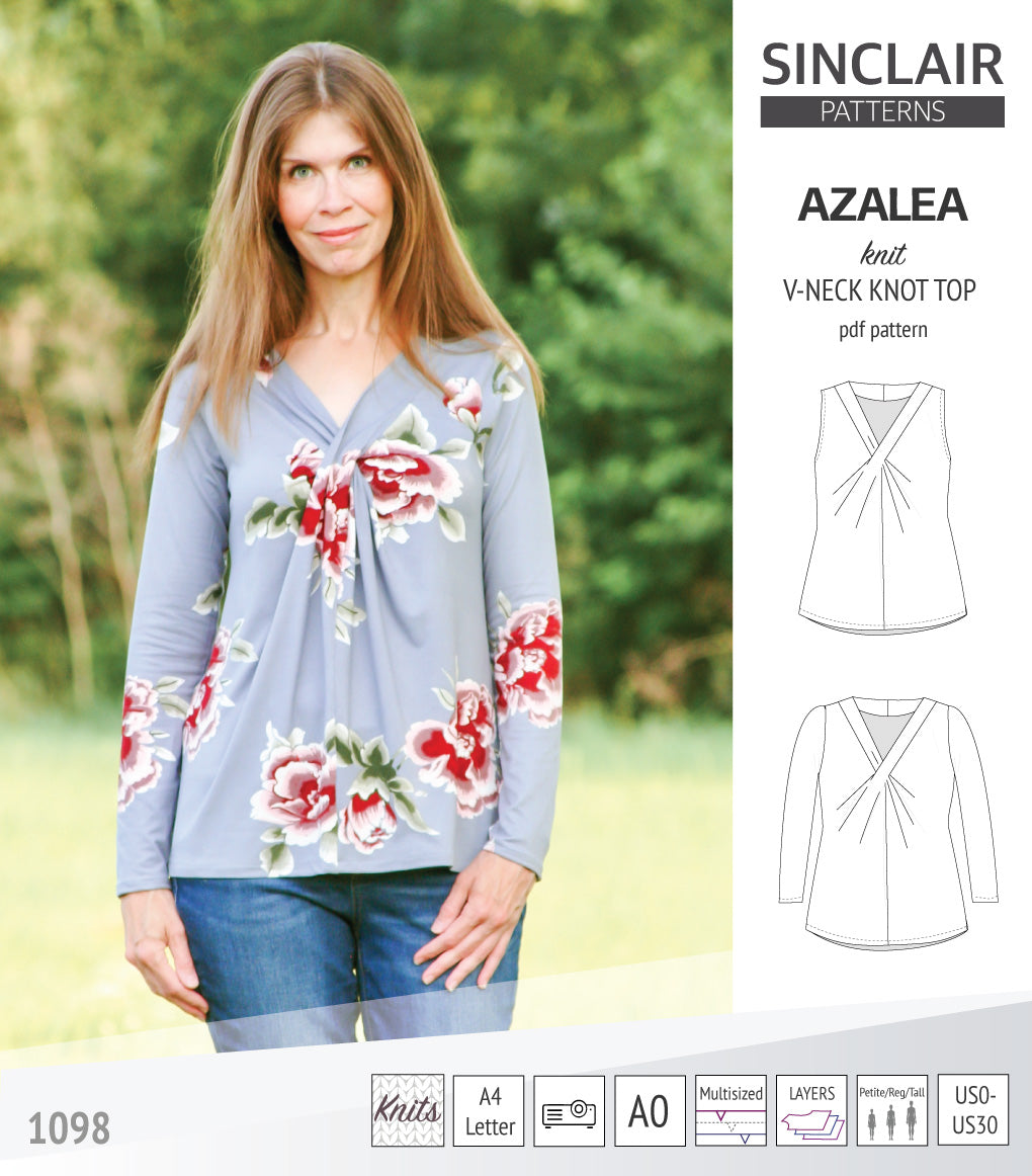 Basic fit: Fitted at the shoulders and bust, relaxed at the waist and hips top with medium depth V-neck finished with an accent knot, designed for knit fabrics. Comes in hip length top. Offered with short, elbow, 3/4 or long sleeves. Can be made as a sleeveless top with the armholes finished with bindings.