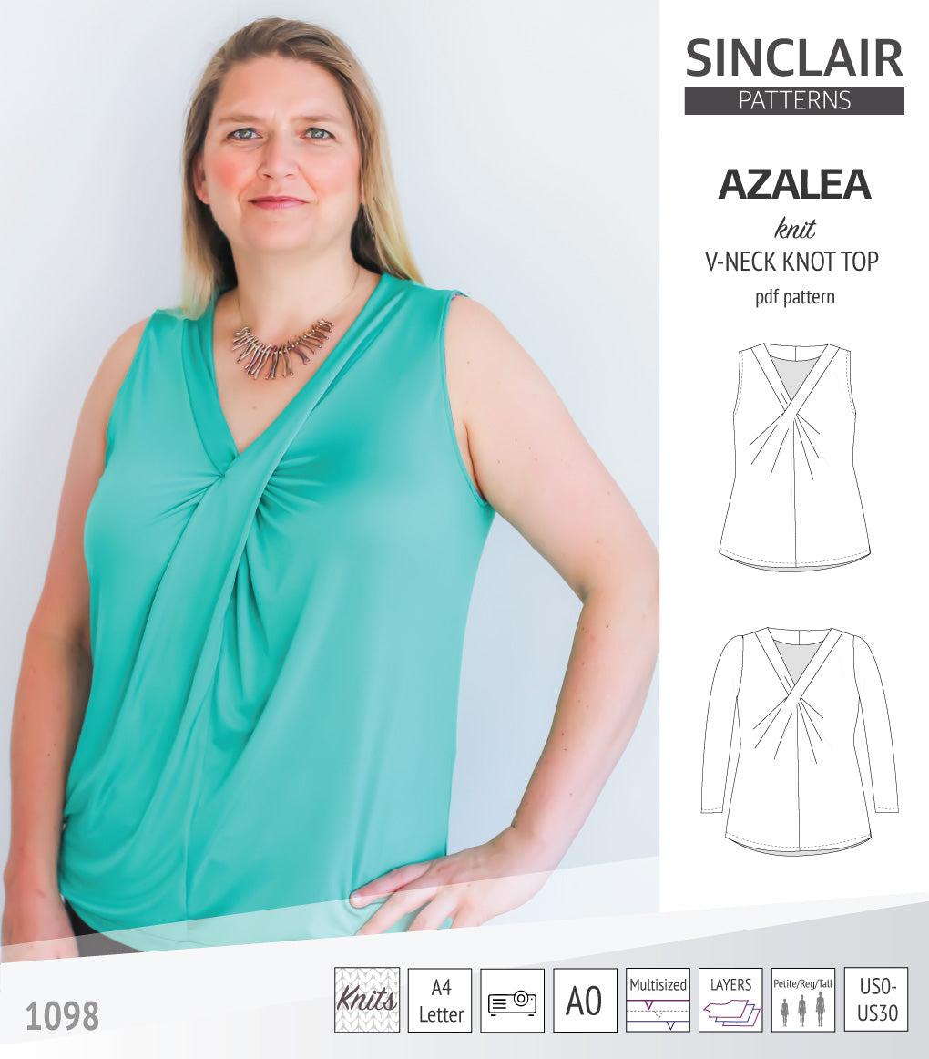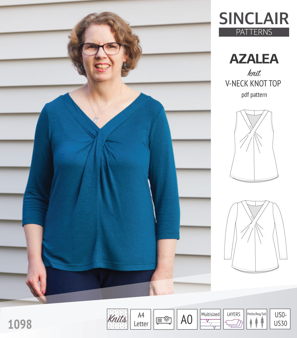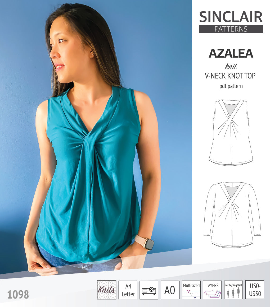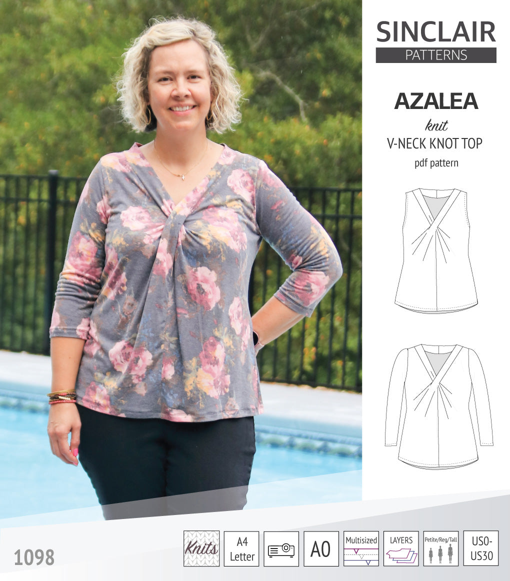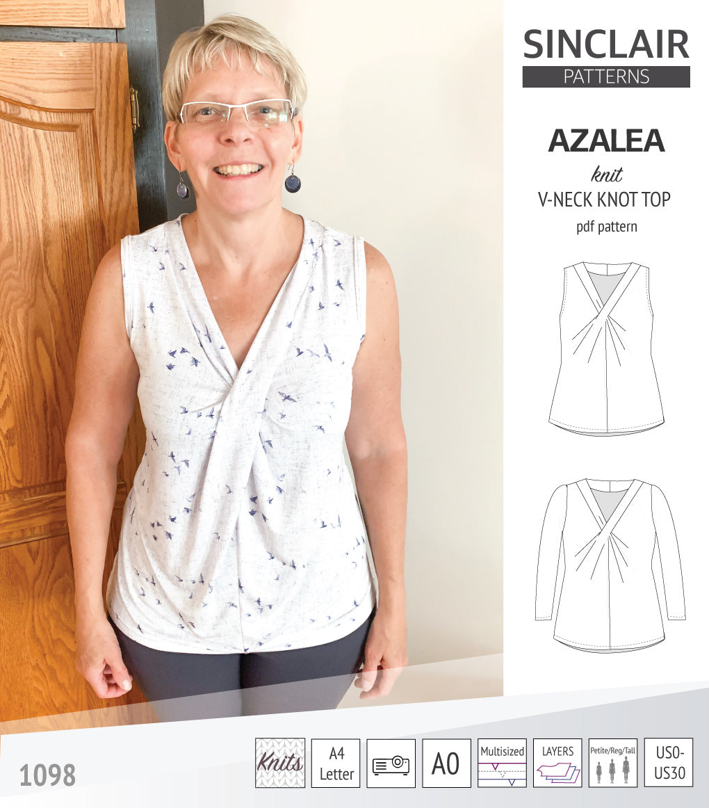 Basic fit: Fitted at the shoulders and bust, relaxed at the waist and hips top with medium depth V-neck finished with an accent knot, designed for knit fabrics. Comes in hip length top. Offered with short, elbow, 3/4 or long sleeves. Can be made as a sleeveless top with the armholes finished with bindings.