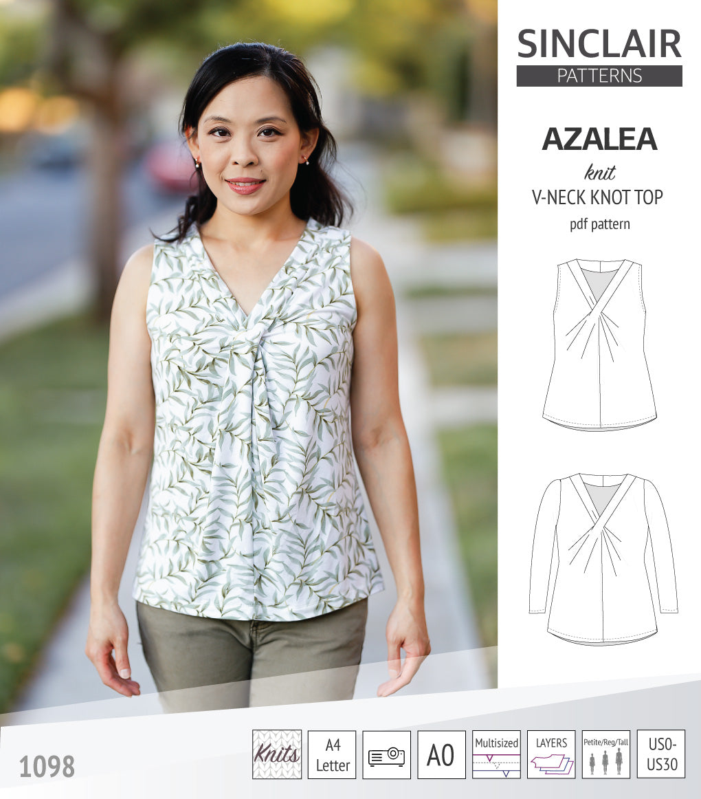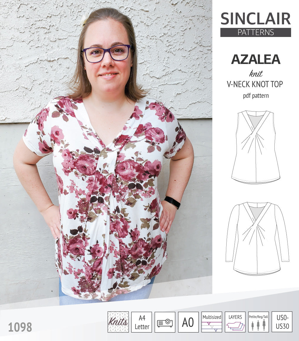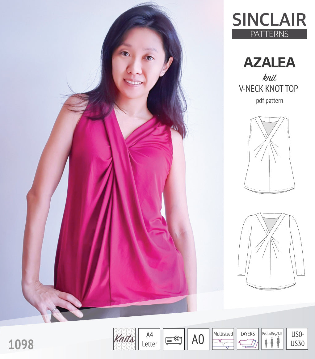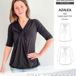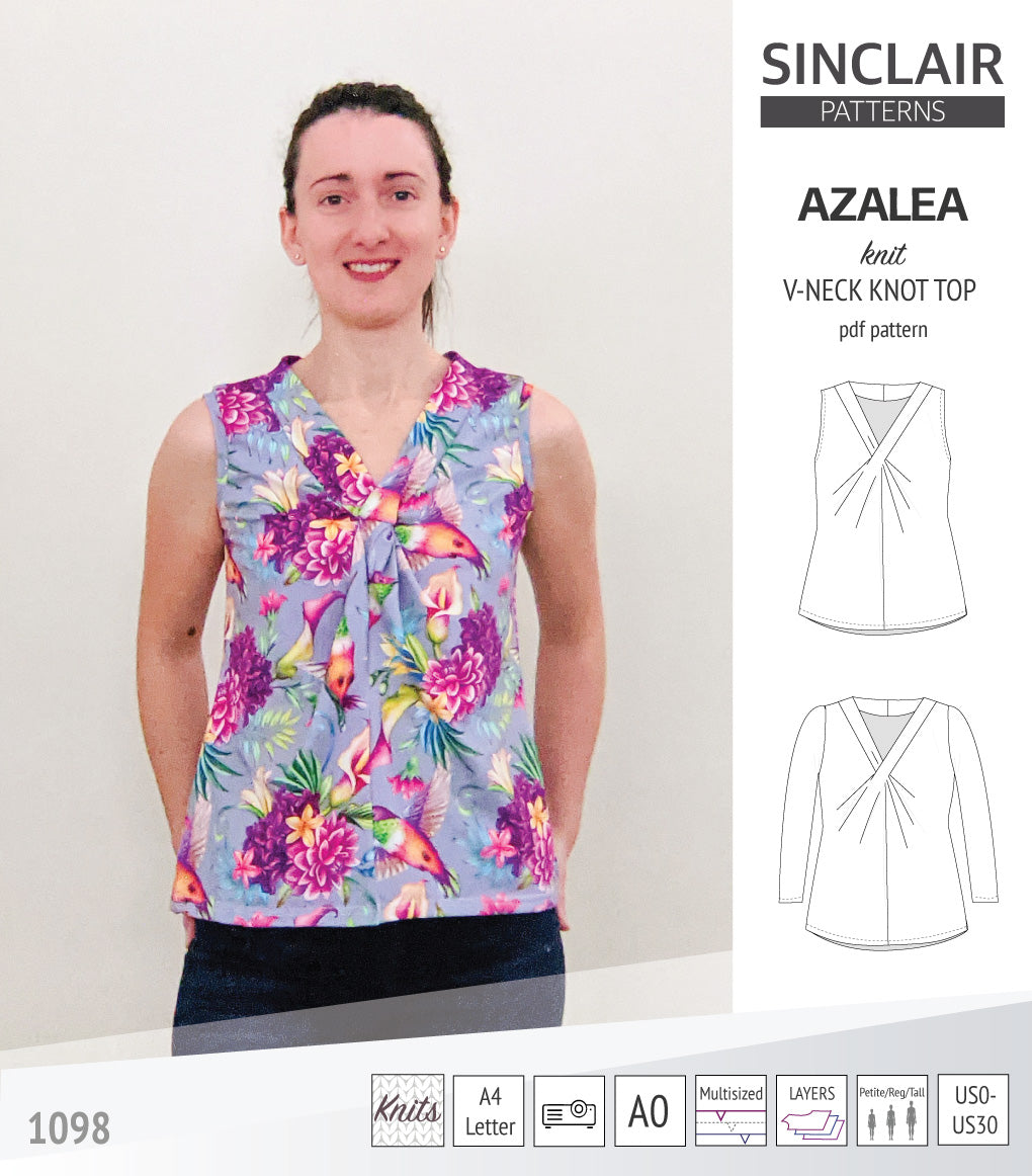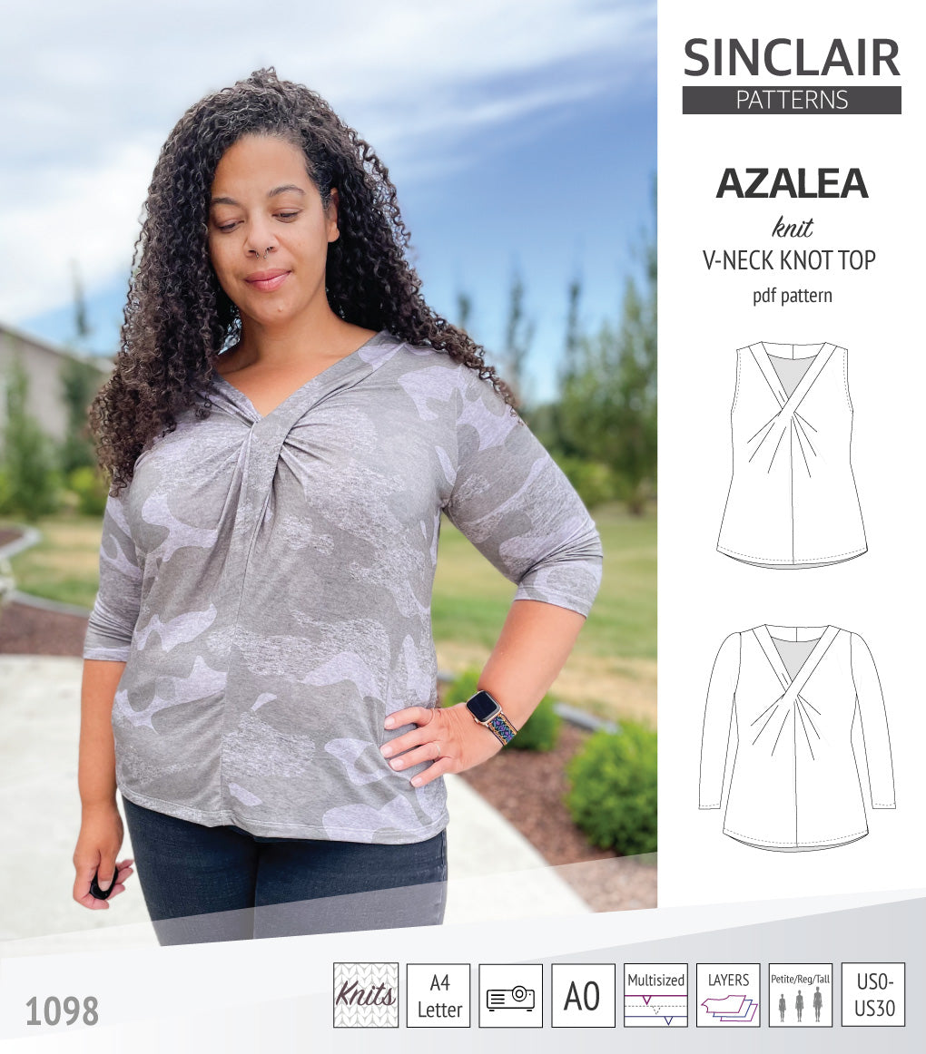 Basic fit: Fitted at the shoulders and bust, relaxed at the waist and hips top with medium depth V-neck finished with an accent knot, designed for knit fabrics. Comes in hip length top. Offered with short, elbow, 3/4 or long sleeves. Can be made as a sleeveless top with the armholes finished with bindings.