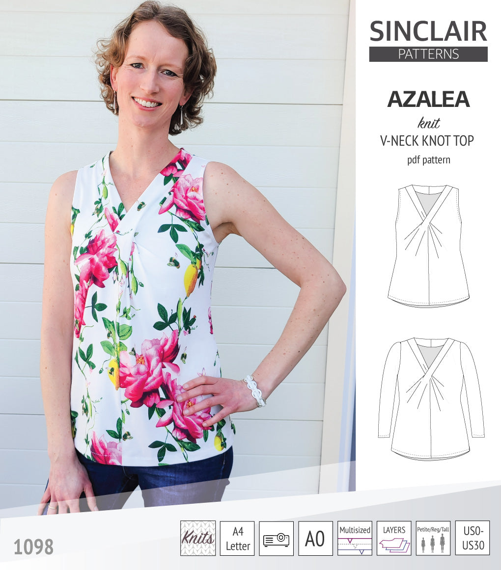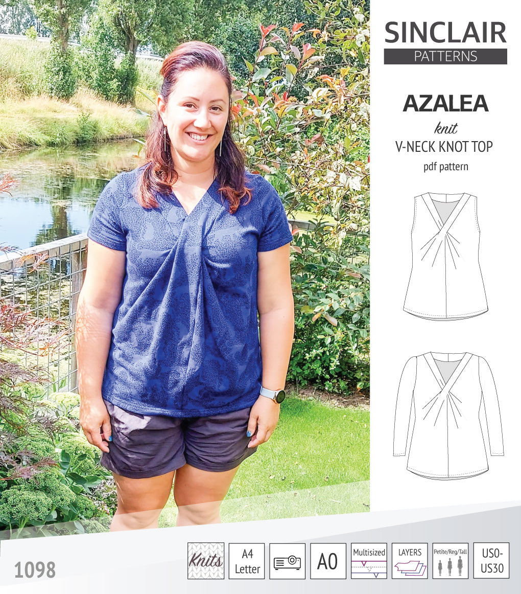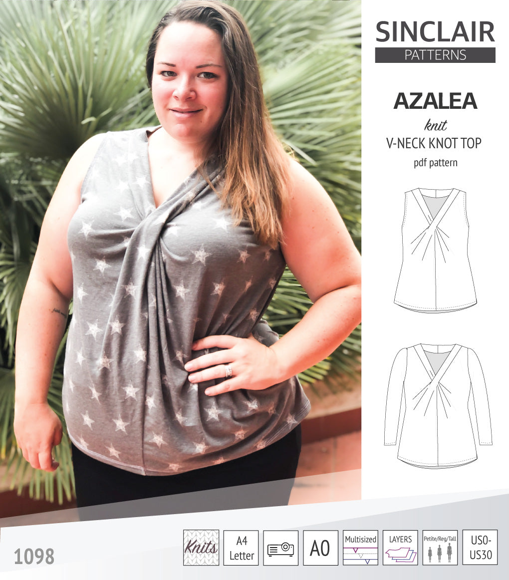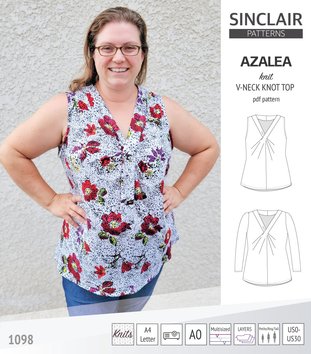 Basic fit: Fitted at the shoulders and bust, relaxed at the waist and hips top with medium depth V-neck finished with an accent knot, designed for knit fabrics. Comes in hip length top. Offered with short, elbow, 3/4 or long sleeves. Can be made as a sleeveless top with the armholes finished with bindings.