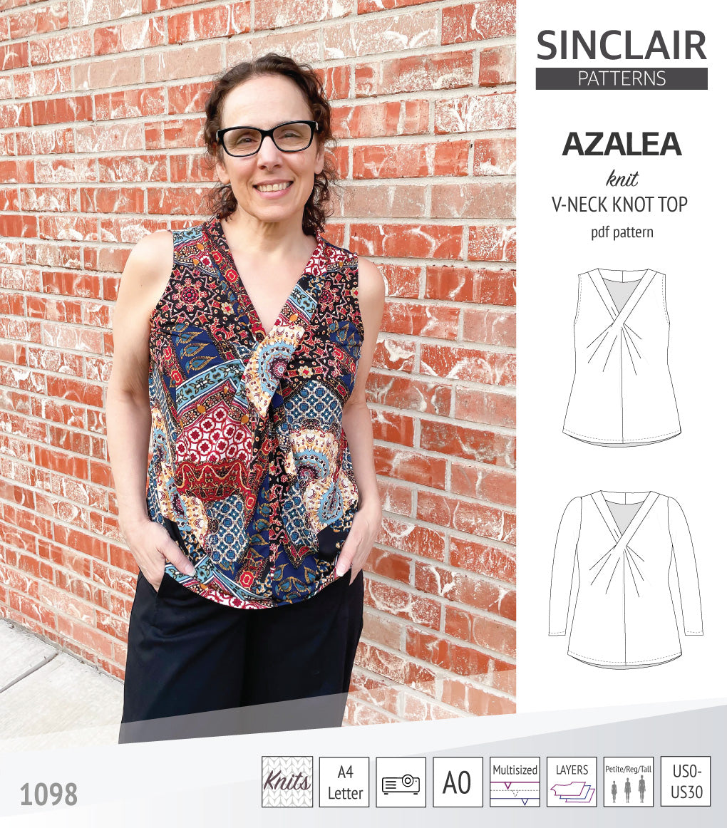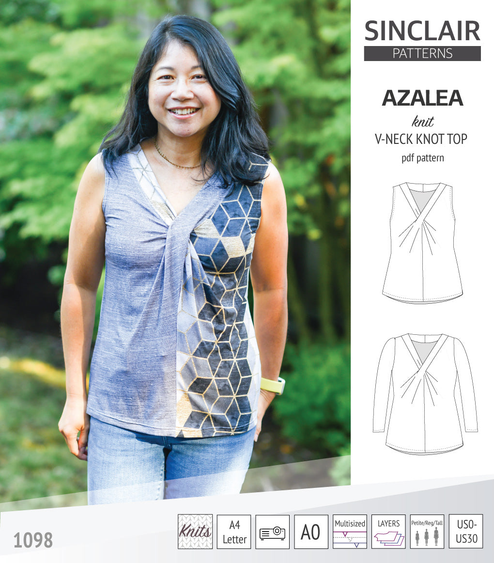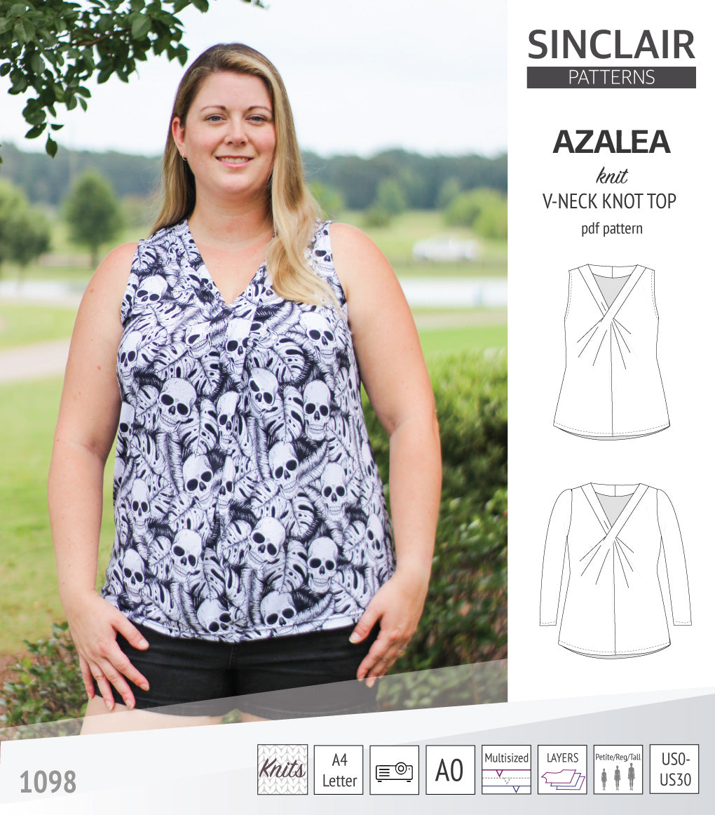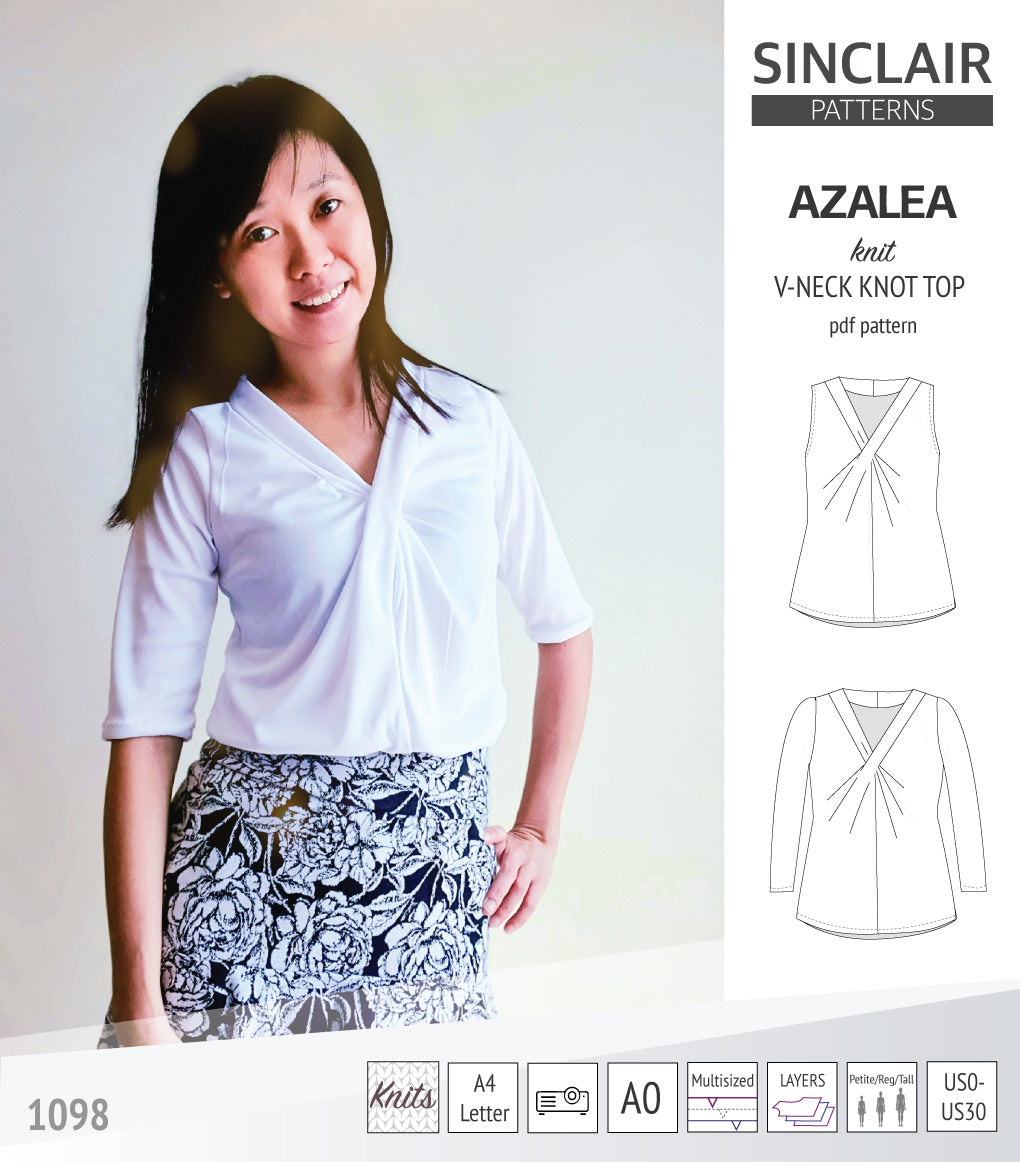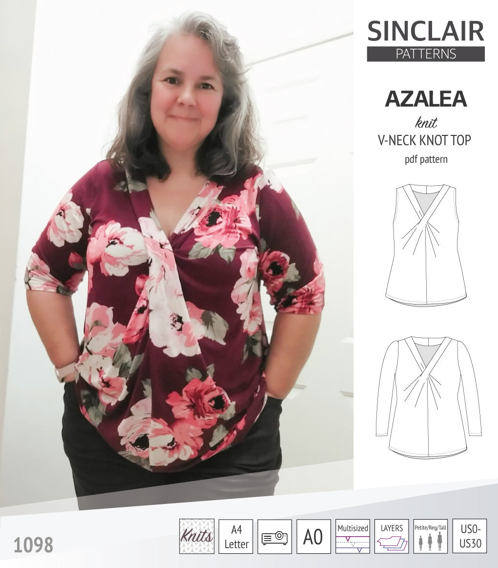Basic fit: Fitted at the shoulders and bust, relaxed at the waist and hips top with medium depth V-neck finished with an accent knot, designed for knit fabrics. Comes in hip length top. Offered with short, elbow, 3/4 or long sleeves. Can be made as a sleeveless top with the armholes finished with bindings.