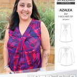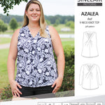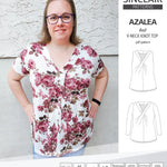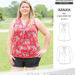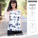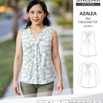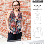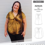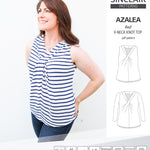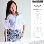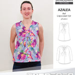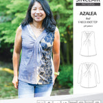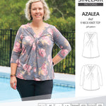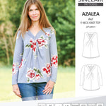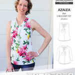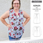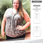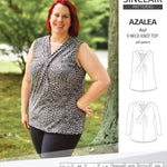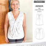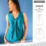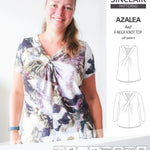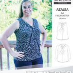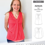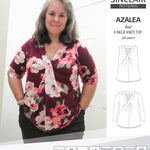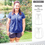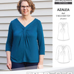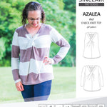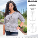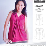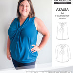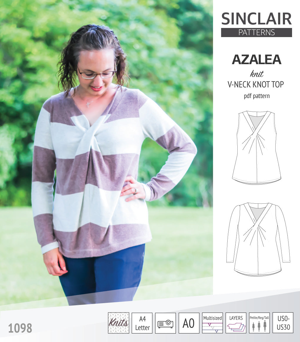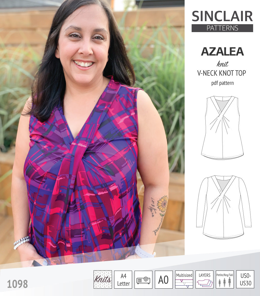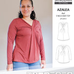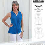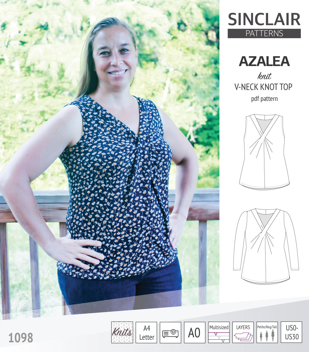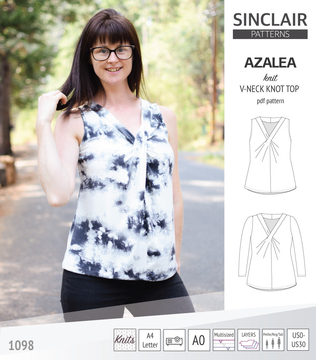 Basic fit: Fitted at the shoulders and bust, relaxed at the waist and hips top with medium depth V-neck finished with an accent knot, designed for knit fabrics. Comes in hip length top. Offered with short, elbow, 3/4 or long sleeves. Can be made as a sleeveless top with the armholes finished with bindings.