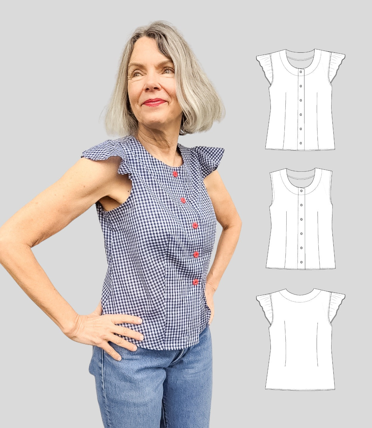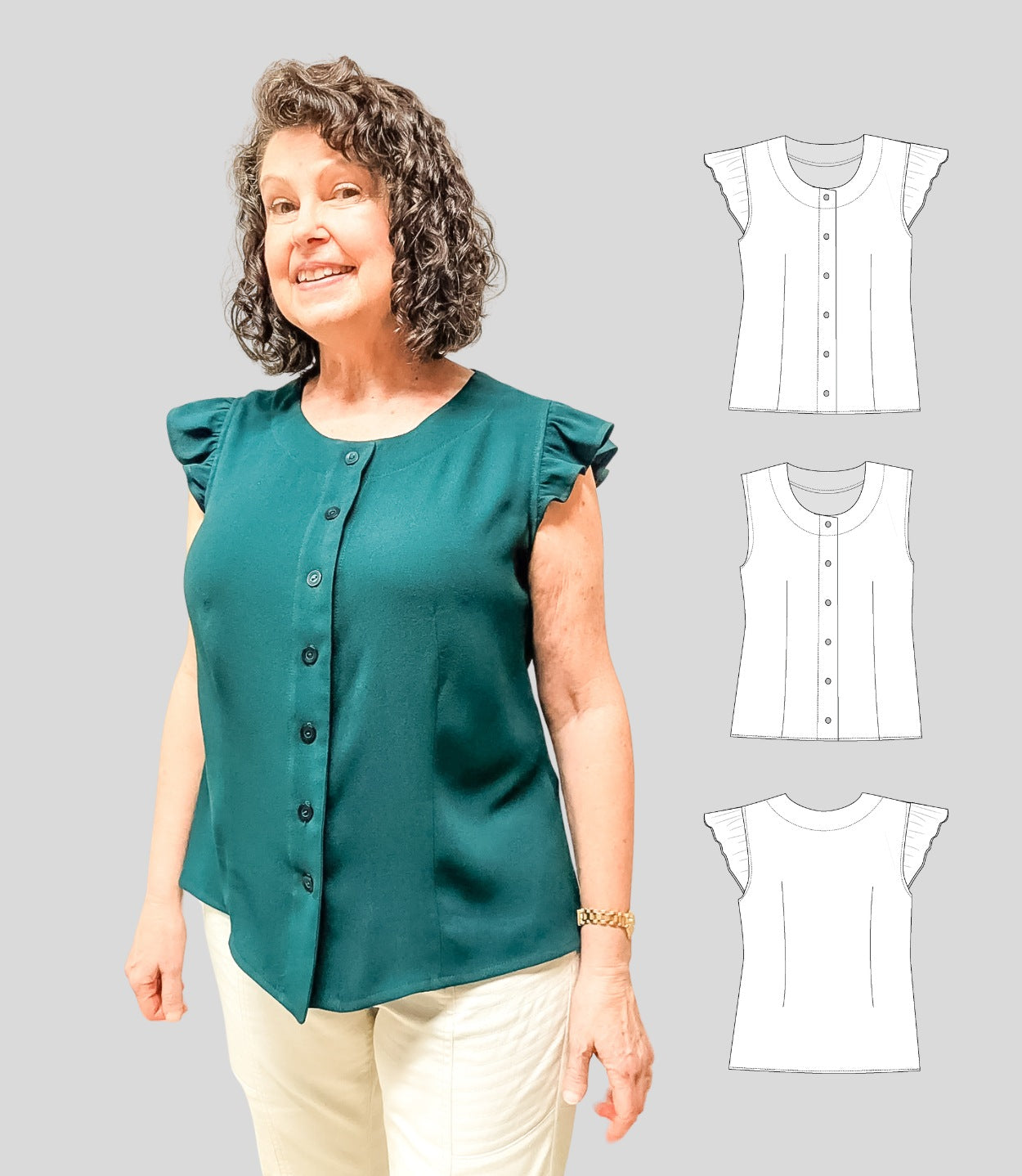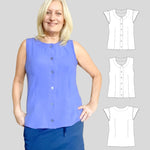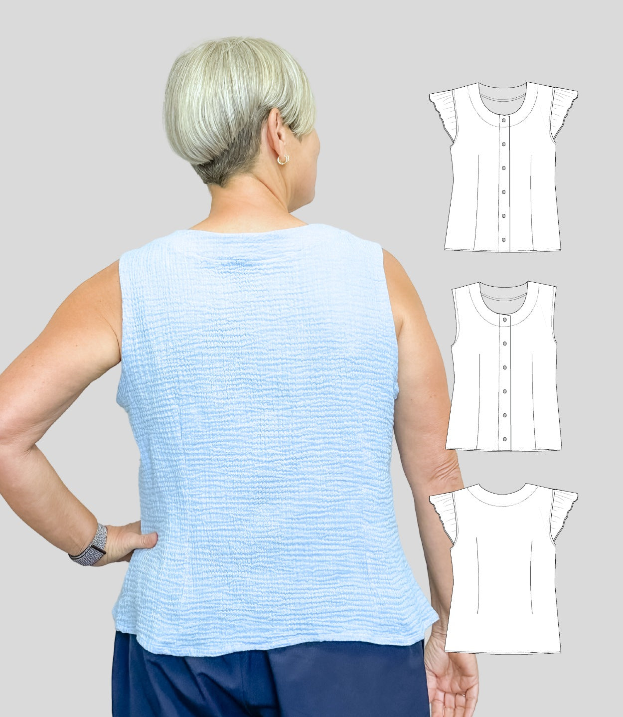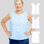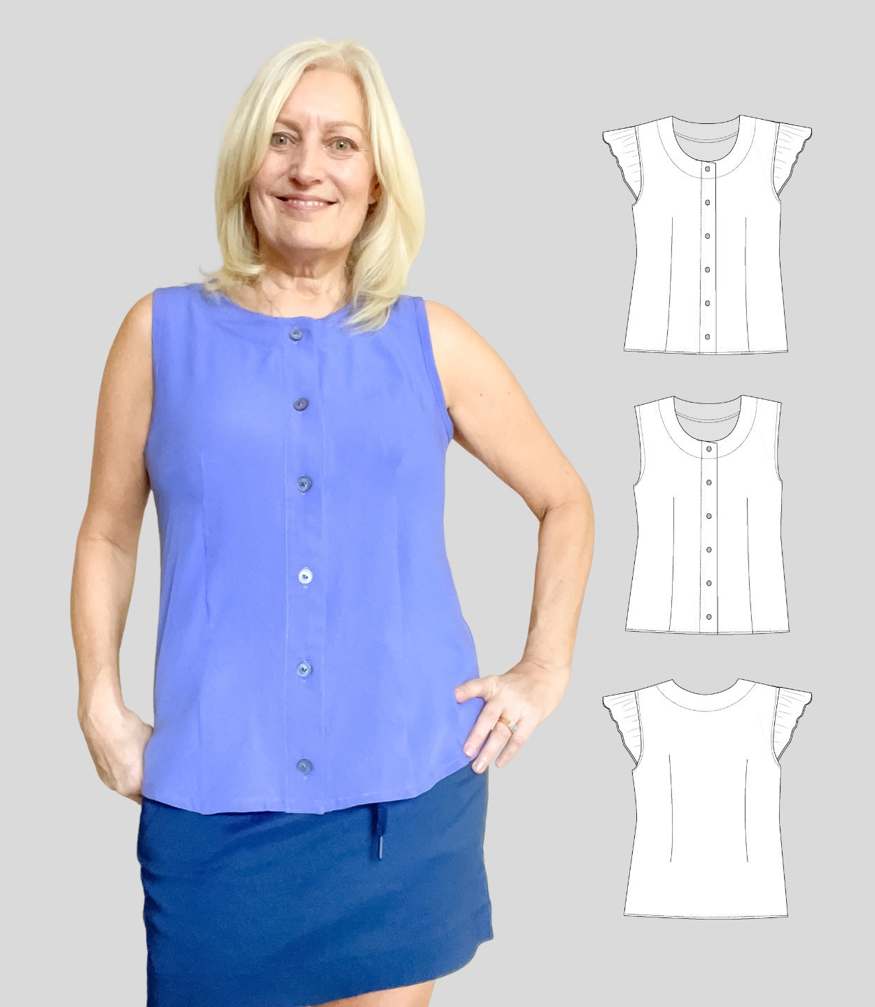 Featuring:  Semi-fitted woven top with front button placket and round neckline. Front and back necklines and placket are finished with a facing. Single front bust darts for cups A-B, C-D and E-F. Back darts for slight waist shaping. Comes as a sleeveless top or a top with gathered flutter or flounce sleeves. All options are finished with enclosed bias binding at the armhole. Comes in a hip (full) and shorter (approx 7.5/3 in shorter) lengths.