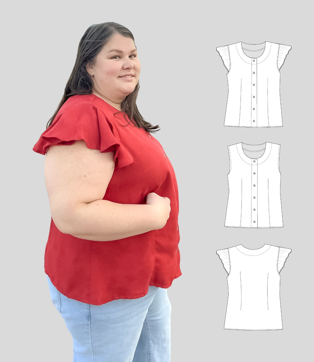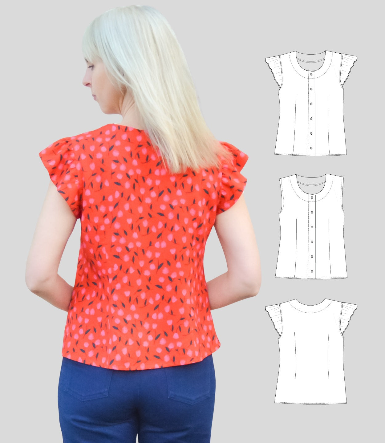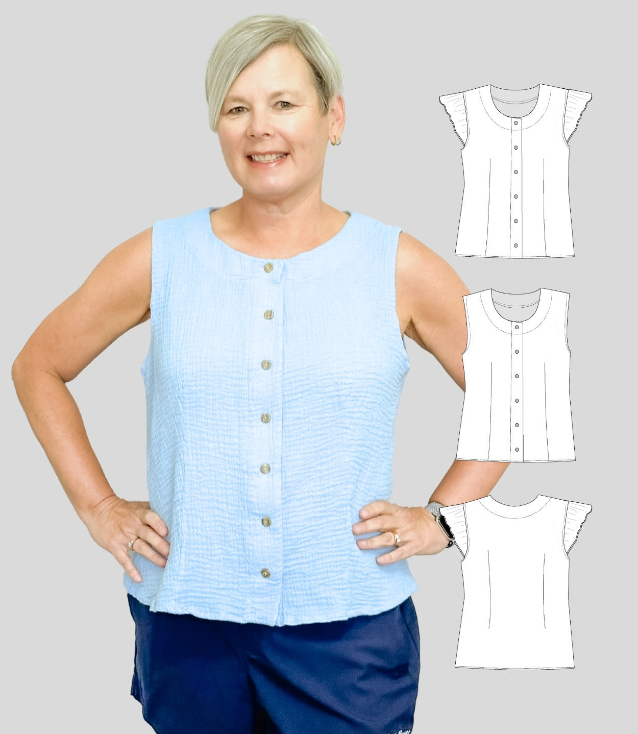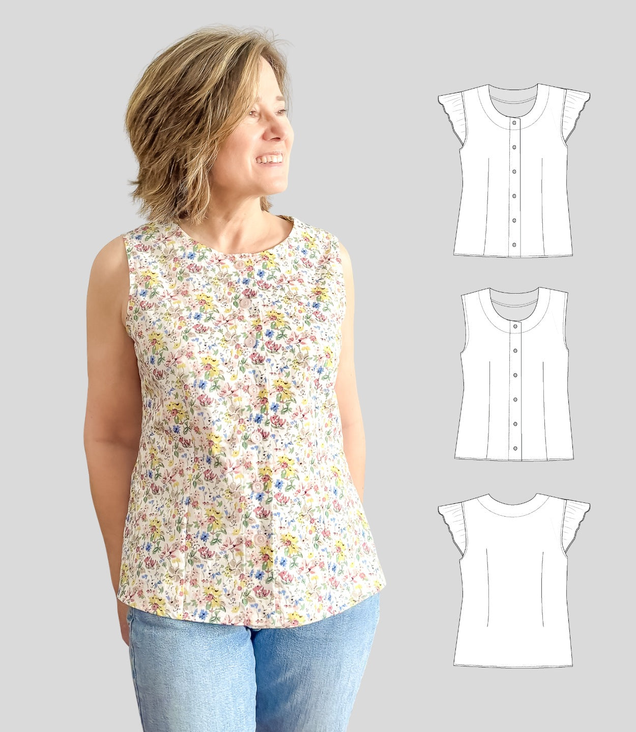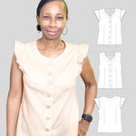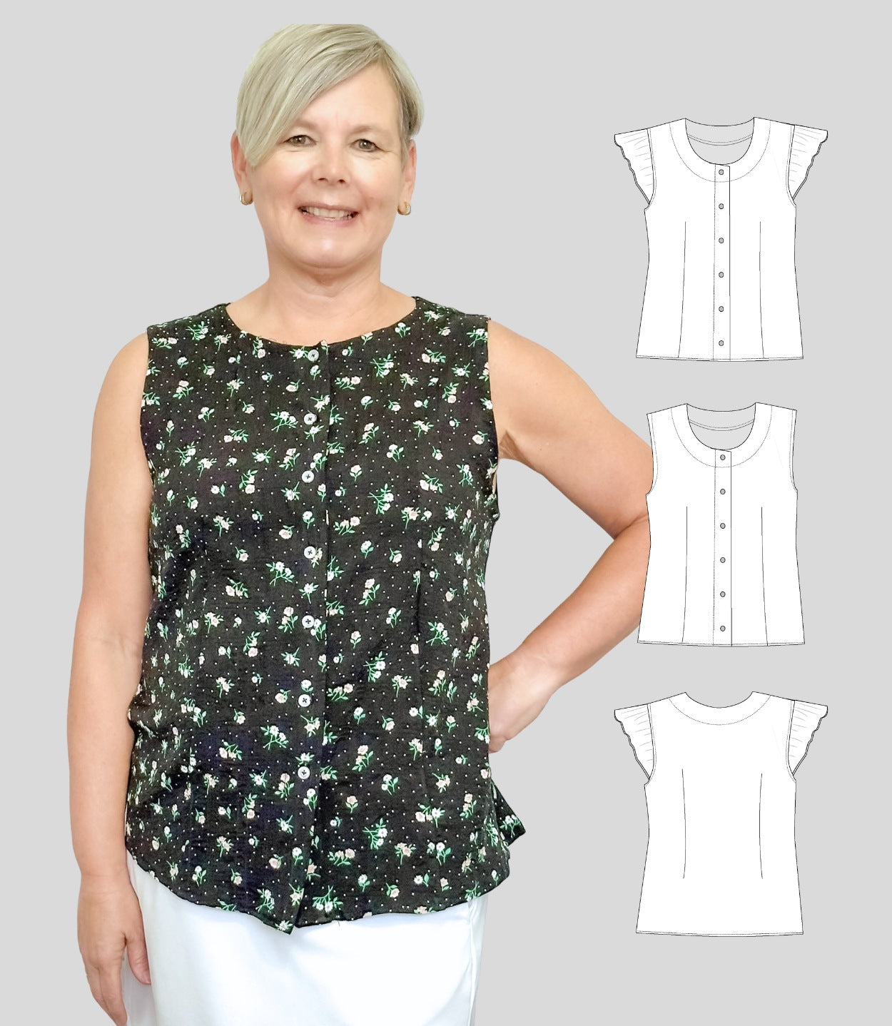 Featuring:  Semi-fitted woven top with front button placket and round neckline. Front and back necklines and placket are finished with a facing. Single front bust darts for cups A-B, C-D and E-F. Back darts for slight waist shaping. Comes as a sleeveless top or a top with gathered flutter or flounce sleeves. All options are finished with enclosed bias binding at the armhole. Comes in a hip (full) and shorter (approx 7.5/3 in shorter) lengths.