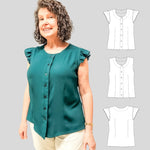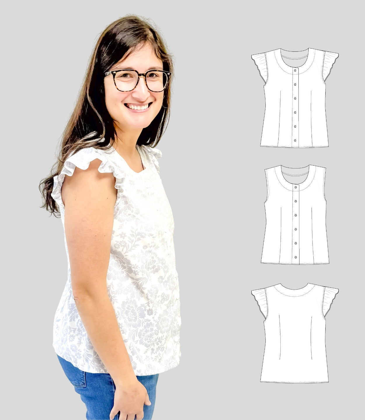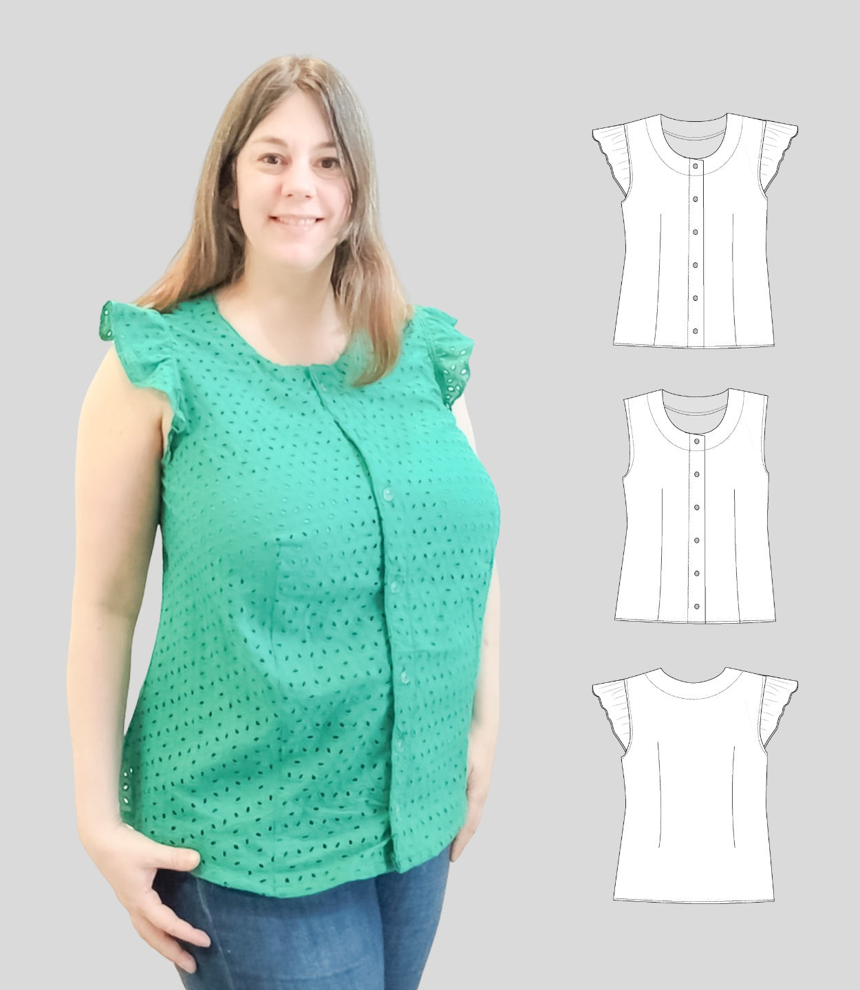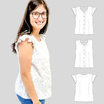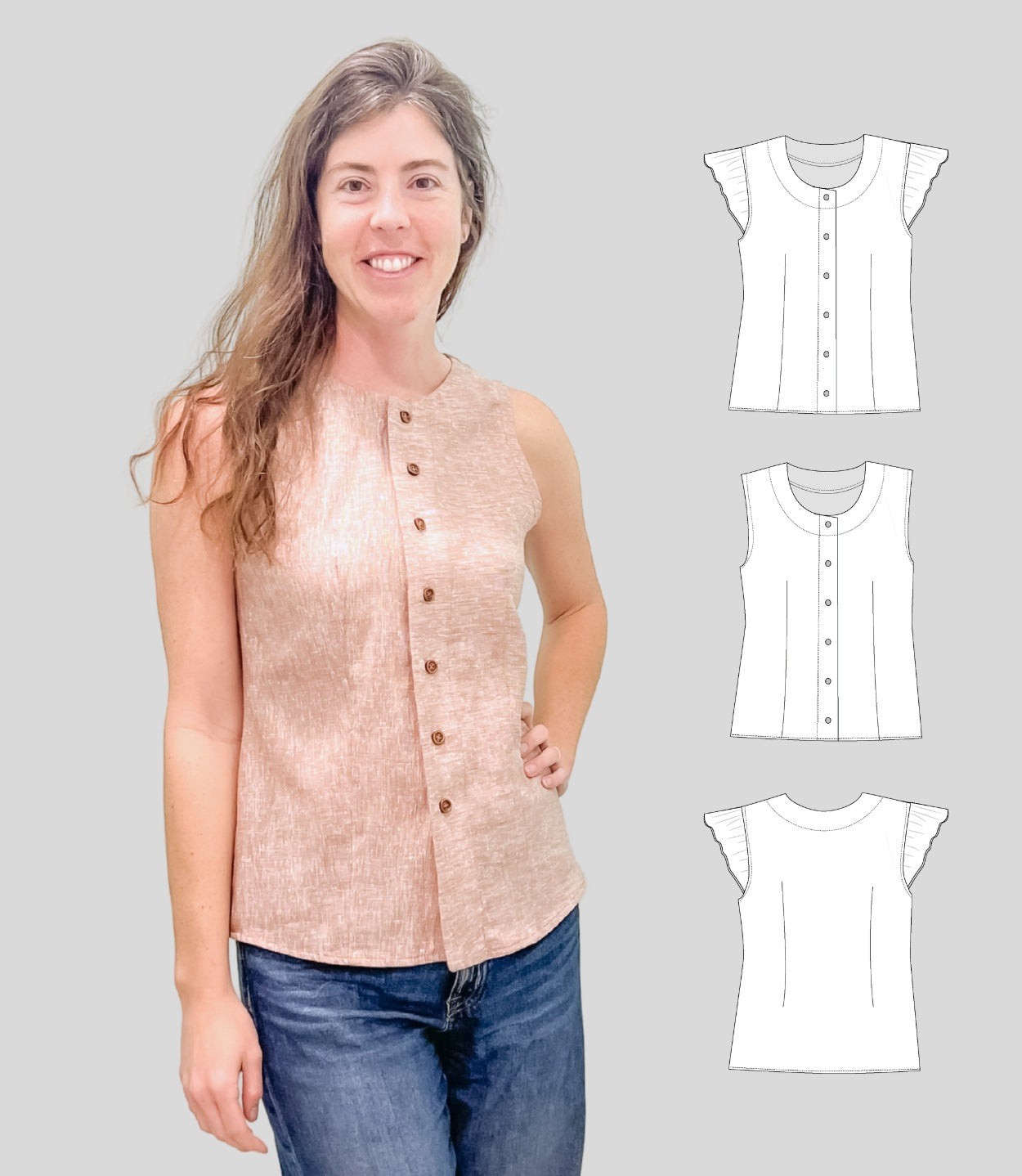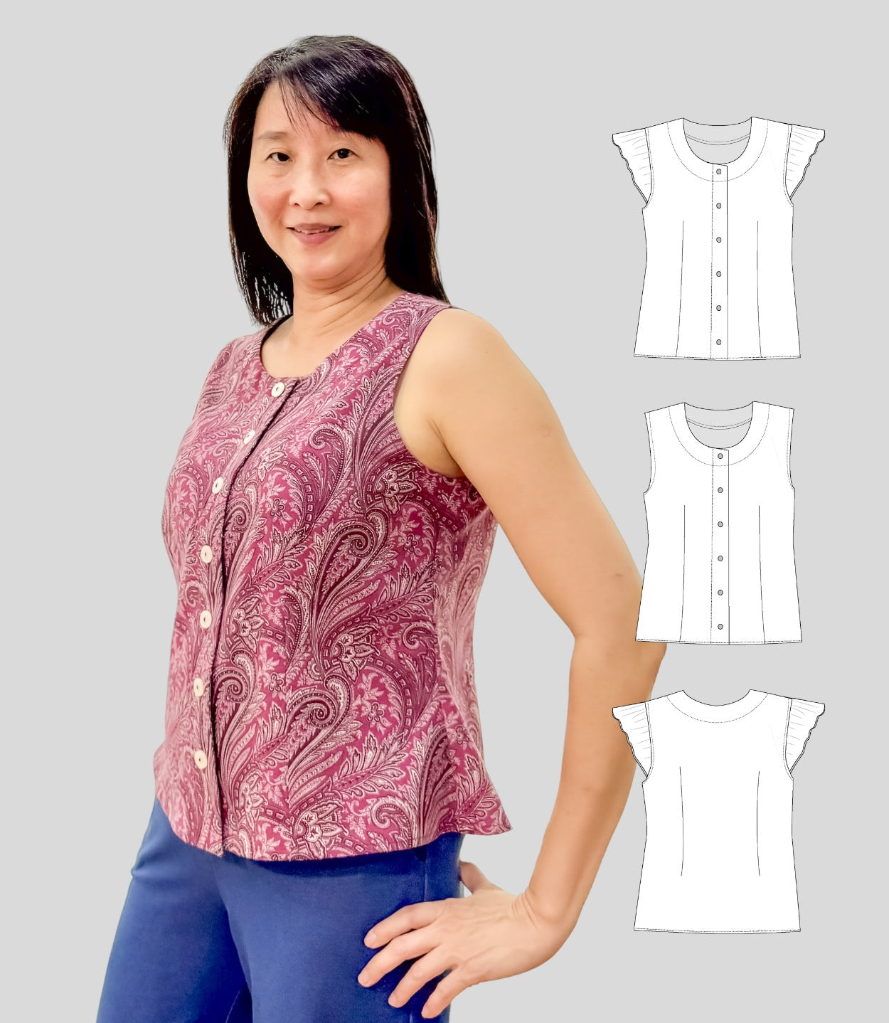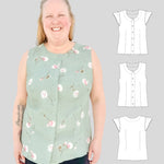 Featuring:  Semi-fitted woven top with front button placket and round neckline. Front and back necklines and placket are finished with a facing. Single front bust darts for cups A-B, C-D and E-F. Back darts for slight waist shaping. Comes as a sleeveless top or a top with gathered flutter or flounce sleeves. All options are finished with enclosed bias binding at the armhole. Comes in a hip (full) and shorter (approx 7.5/3 in shorter) lengths.