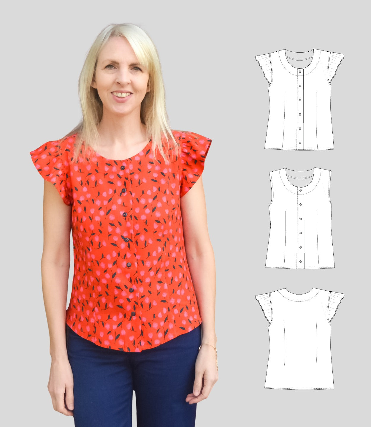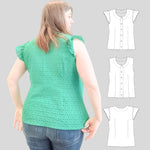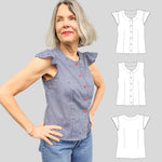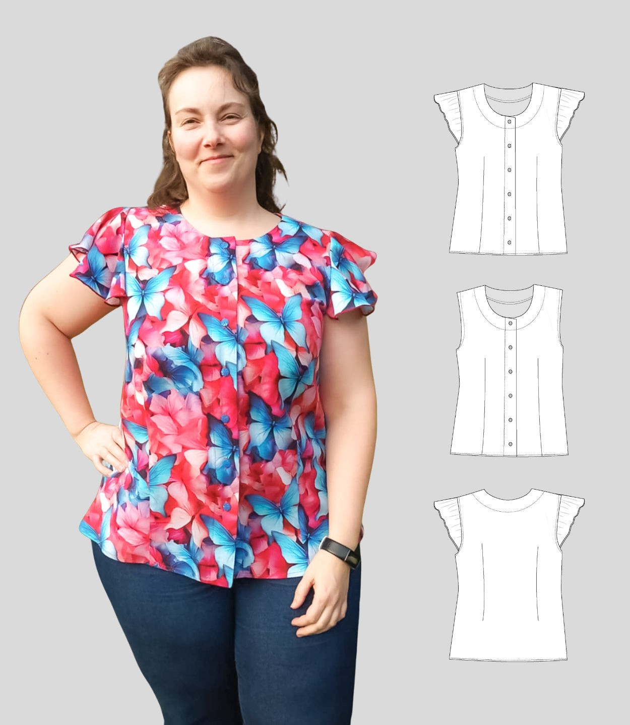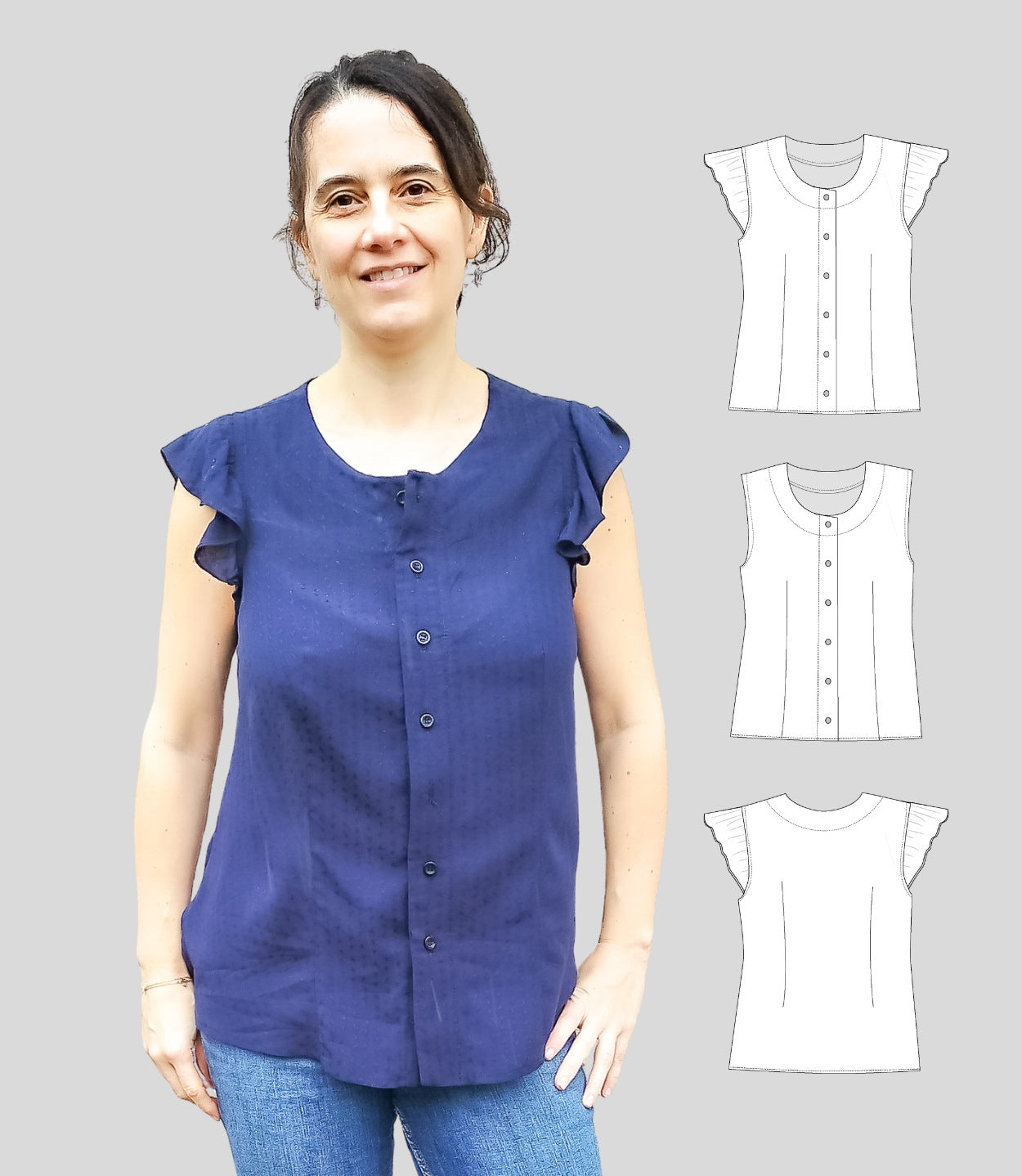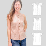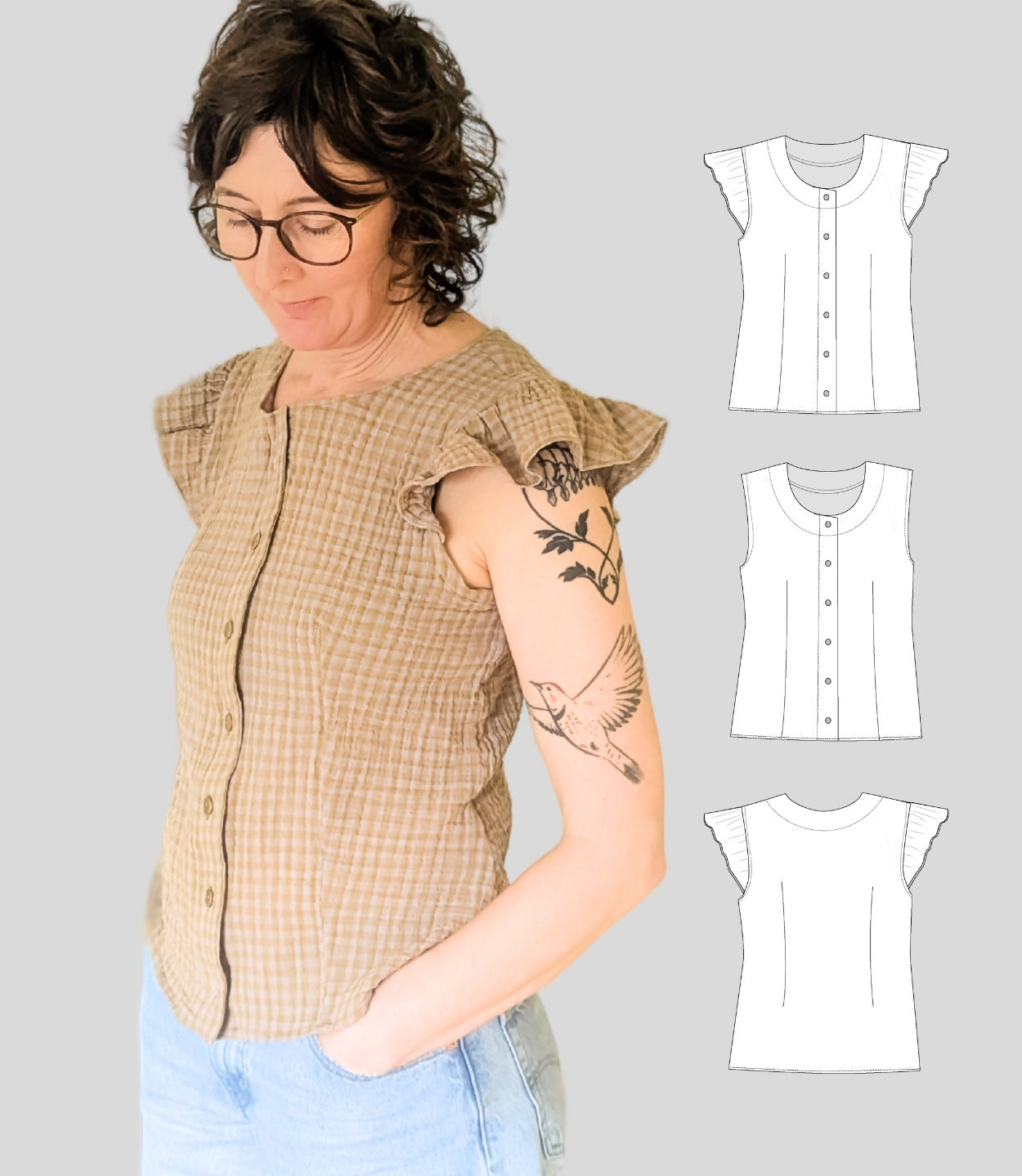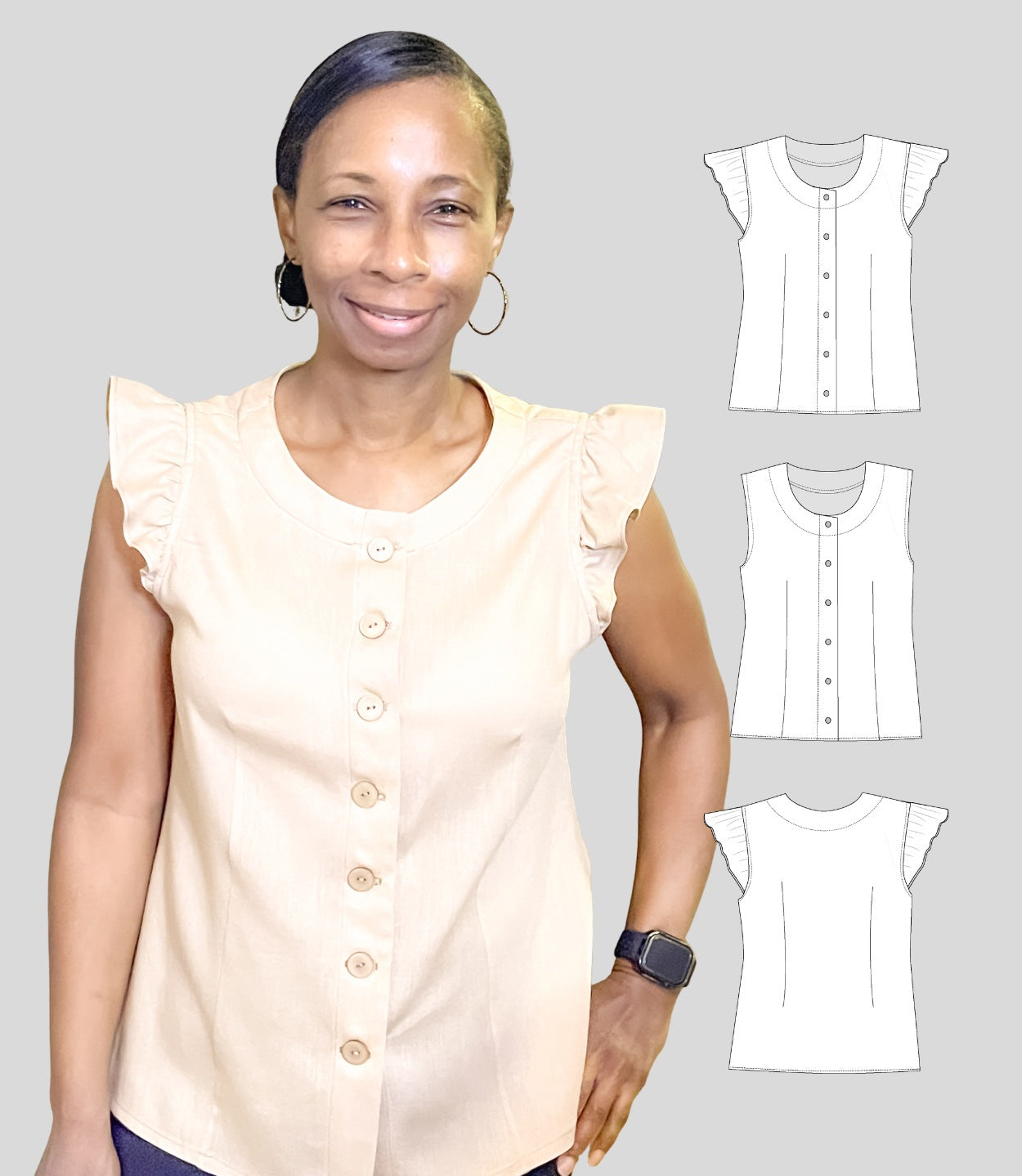 Featuring:  Semi-fitted woven top with front button placket and round neckline. Front and back necklines and placket are finished with a facing. Single front bust darts for cups A-B, C-D and E-F. Back darts for slight waist shaping. Comes as a sleeveless top or a top with gathered flutter or flounce sleeves. All options are finished with enclosed bias binding at the armhole. Comes in a hip (full) and shorter (approx 7.5/3 in shorter) lengths.