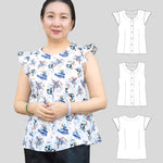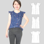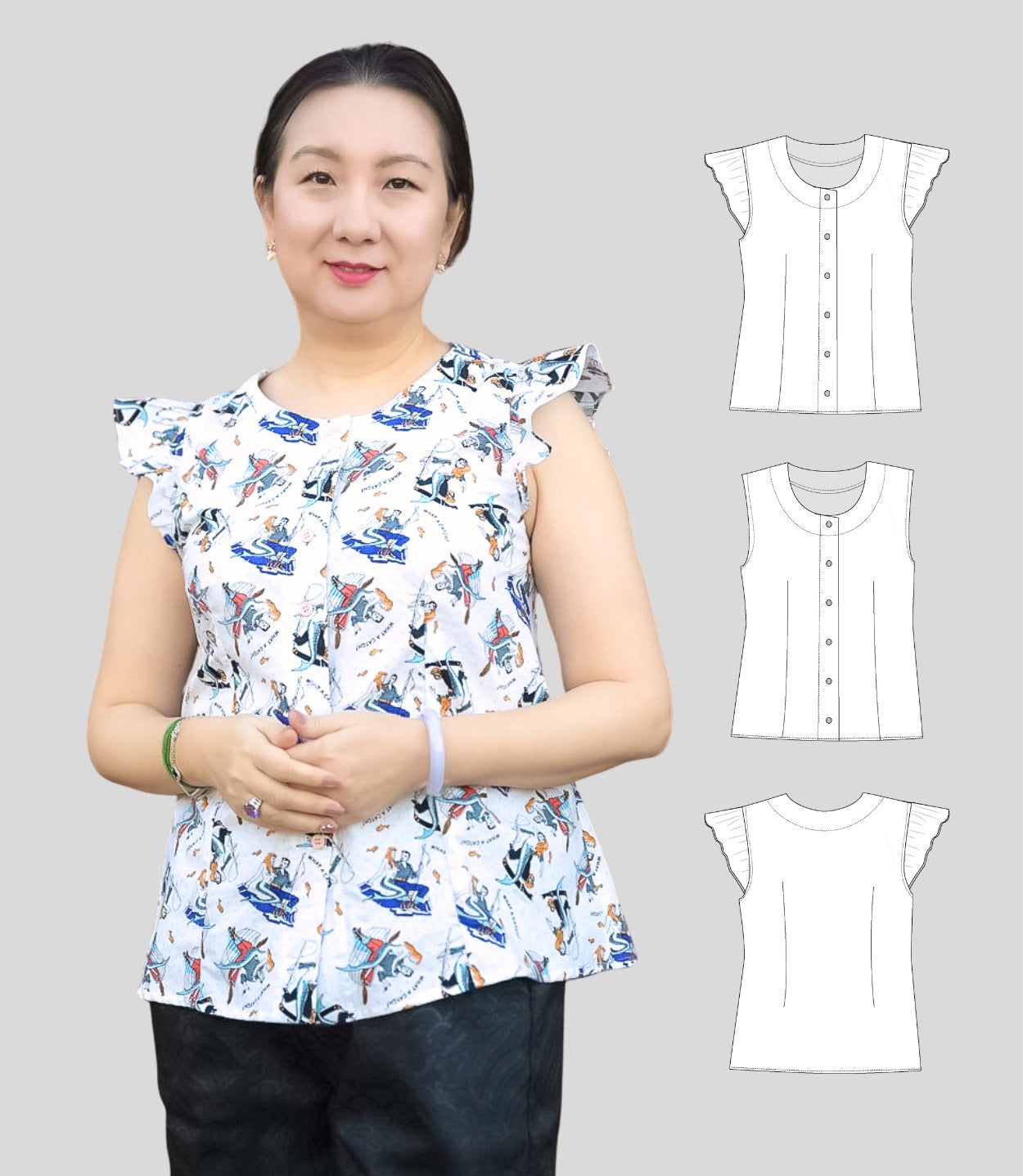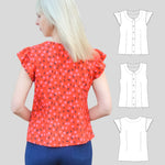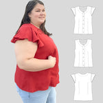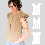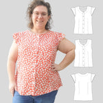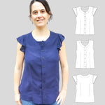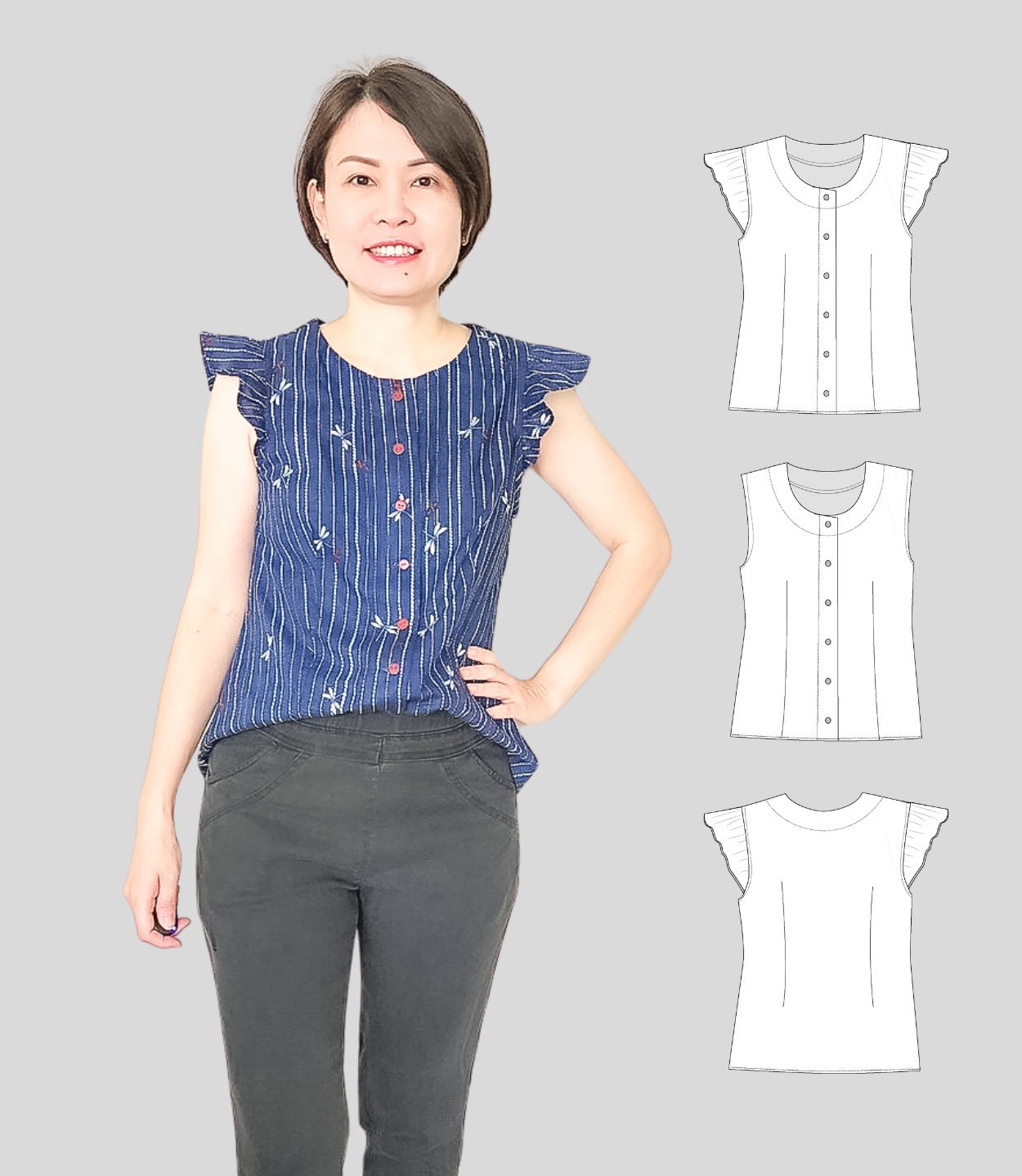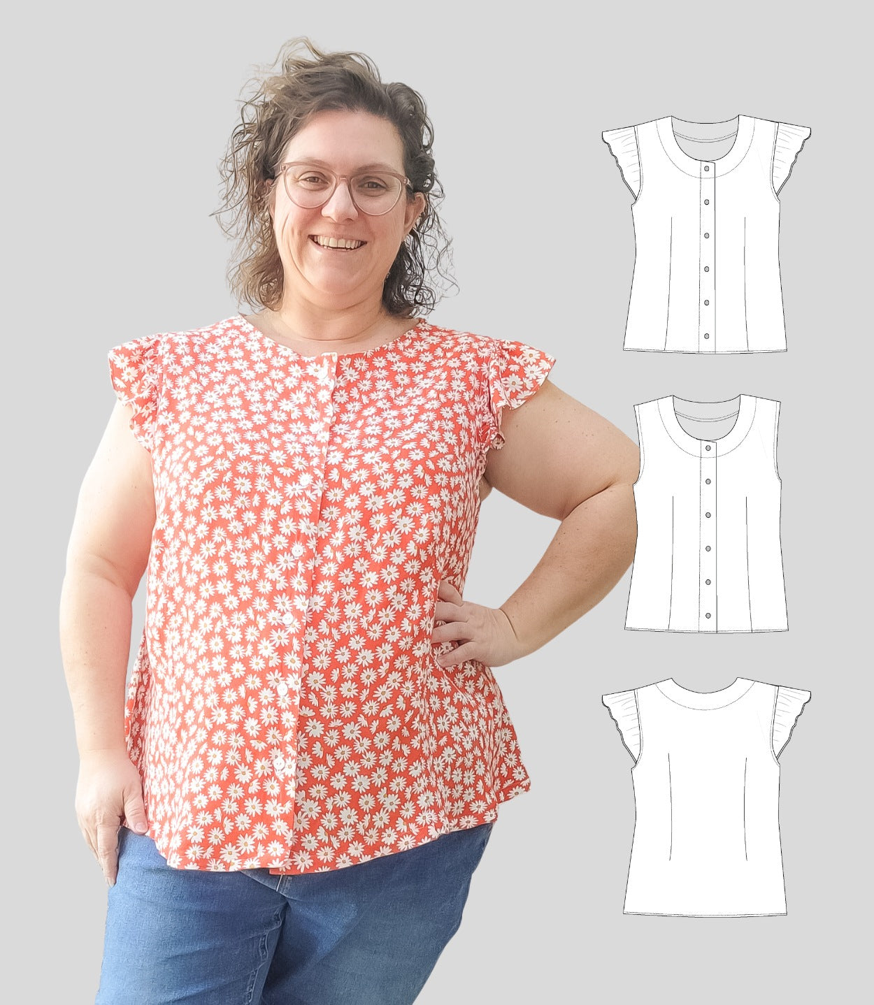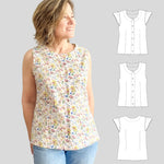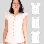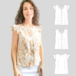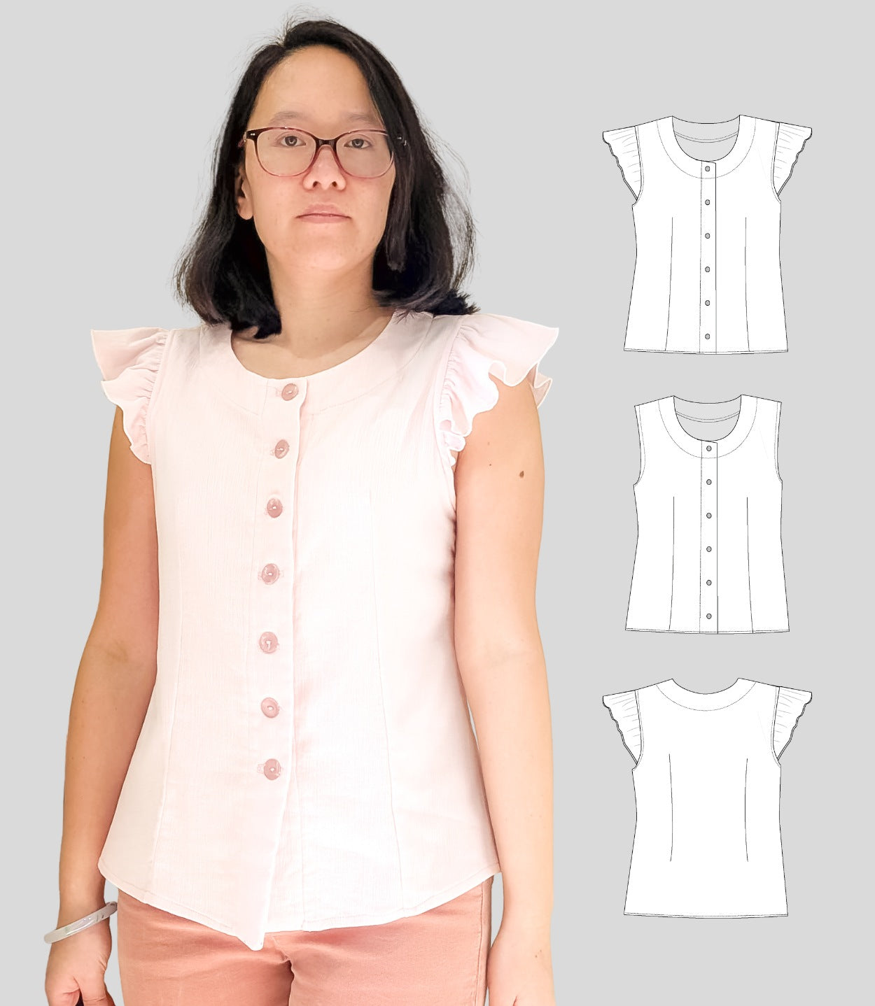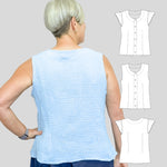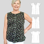 Featuring:  Semi-fitted woven top with front button placket and round neckline. Front and back necklines and placket are finished with a facing. Single front bust darts for cups A-B, C-D and E-F. Back darts for slight waist shaping. Comes as a sleeveless top or a top with gathered flutter or flounce sleeves. All options are finished with enclosed bias binding at the armhole. Comes in a hip (full) and shorter (approx 7.5/3 in shorter) lengths.
