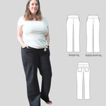Fit and options: Fitted at the hips and waist, straight or slightly flared leg pants designed for medium to heavy weight knit fabrics like ponte, crepe double knits and similar. Contouring yoke at the back. Finished with contoured waistband that is reinforced with elastic. Optional faux fly, side and back patch pockets.