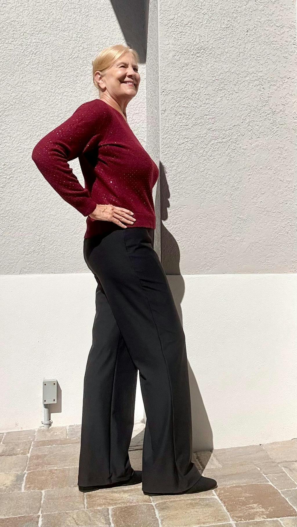 View B - SLIGHTLY FLARED LEG pants with a faux fly and side pockets